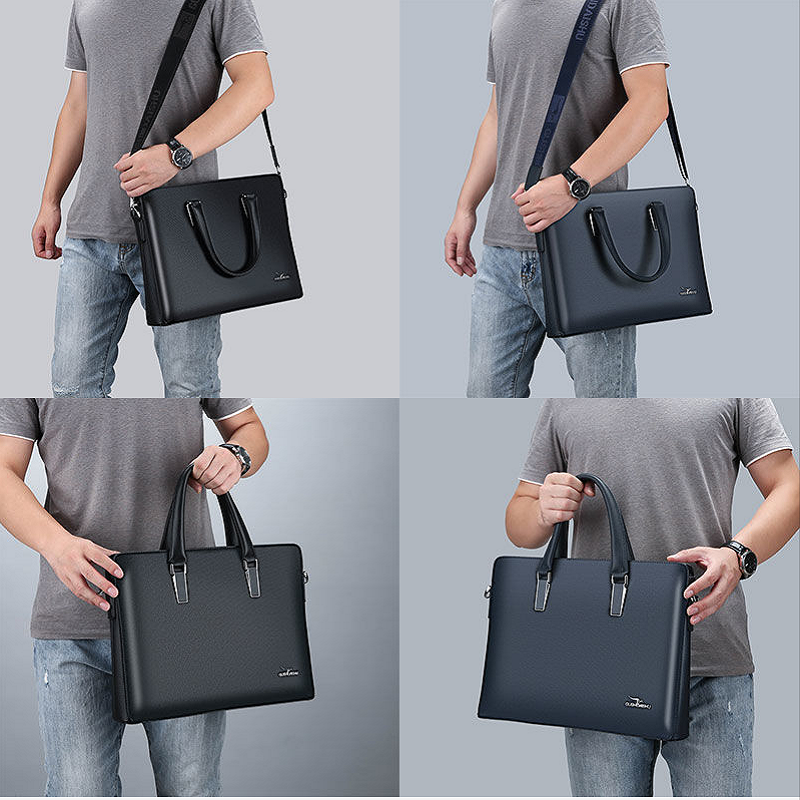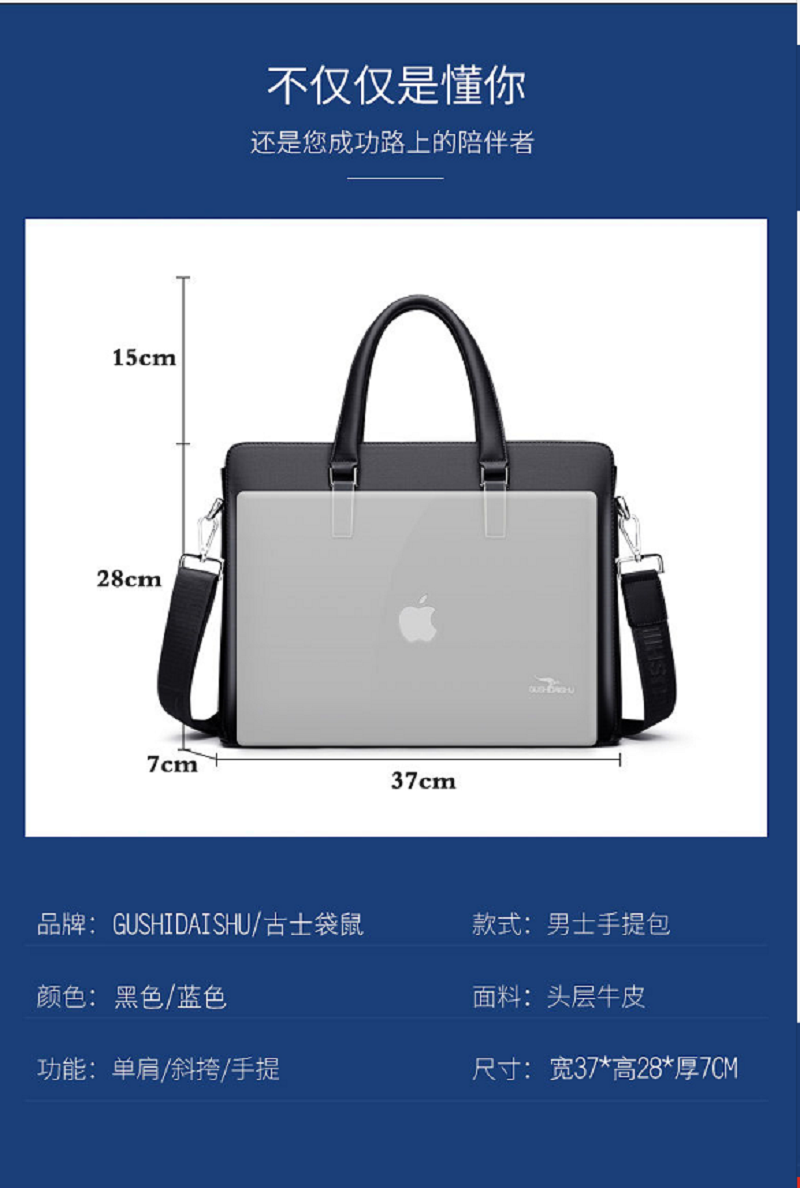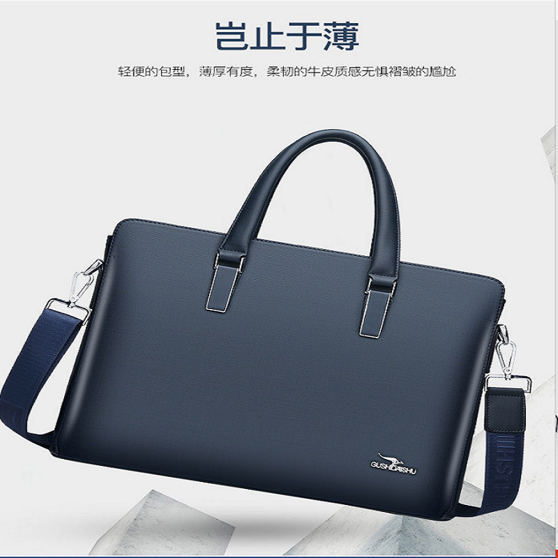 古士袋鼠男包商務手提包男士單肩包休閑皮包橫款公文包真皮斜挎包藍色